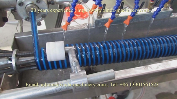 vacuum feeder→ single screw extruder → extrusion mould → spiral forming machine → water cooling calibration tank →floating cooling tank→ hauling off unit